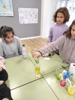 Una vez conocidos y trabajados estos conceptos LH3. Se ha reflexionado sobre cómo explicarlo a los alumnos del curso. En grupos pequeños han preparado diferentes experimentos durante una hora. Tras el experimento, se dieron explicaciones en clase al estilo de los científicos. No es broma, han sido capaces de explicar experimentalmente el ciclo del agua y sus propiedades.
