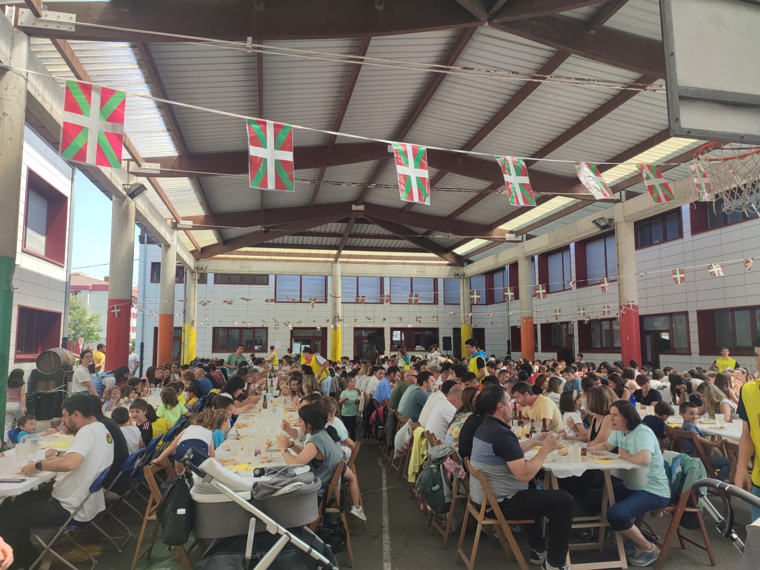 Goizean goizetik nabari zen komunitate usaina pergola zein kiroldegi inguruan. Bazkaltzeko mahaiak antolatzera etorri ziren bolondresak atzera eta aurrera, kiroldegia atontzen ari ziren irakasleak ekitaldirako beharrezko materialak eskuan, bazkaltzeko paella prestatu ahal izateko paellerak eta suak antolatze lanetan beste batzuk, DBHko ikasleak arropa salmenta prestatzen… Emanaldia hasi baino ordu erdi lehenago ikasleez betetzen hasi zen ingurua urduritasunak eta euforiak lagunduta, emanaldia ikustera etorritako familiak ilaran…eta bapatean joareen hotsa kiroldegian, goizean kaleak alaitzen aritu zirenak kiroldegiko urteroko sarrera hunkigarria errepikatuz, aurten gainera Argitxo eta Xalto ere bai! Parte hartu behar zuten ikasleak prest eta harmailak beteta. Aurtengoan, Euskal Herriari, lurraldetasunari egin zitzaion keinua, zazpi probintzietako ohitura, kultura, festak…irudikatuz. Bejondeizuela!Eta emanaldi amaieran Palestinari ere keinua, genozidioan gertatzen ari dena gogora ekarriz, gure haurrak ere badirelako, gureen moduan jaialdi batez gozatzen egon beharko luketelako… Kiroldegiko emanaldiari amaiera emateko DBH4ko ikasleen agurra, txikitatik beraiena izan den ikastola utzi eta bide berri batzuk urratzera doazenaren seinale, oinarri sendoak dituzte ordea topatzen dutenari aurre egiteko. Kiroldegitik irtenda ere, jaiak bazuen tokia, paellaren inguruan familiak, tortila pintxoak, haurrentzat aurpegi margoketa…komunitatea elkartuta berriz ere. Berdin jarraitu zuen festak bazkarian eta bazkalostean ere, gaztaren erronka, errifetan tokatutako sarien zozketak, erromerian denak batera dantzan, ikasle, guraso, irakasle eta ikasle ohi. “Ikastola, gora gure Ikastola!” Biharamunean ere bazegoen zeregina ordea, bezperakoa garbitu beharra zegoen astelehenean ikasleak etortzerako. Tamalez, garbiketarako txandik ez zen bete eta irakasle batzuk aritu ziren lan horretan, mila aldiz eskerrik asko! Hurrengo urtean berriz ere elkartuko gara eta ziur gaude garbiketaren ardura ondo pasa genuen guztiok hartuko dugula, horrelako egun magikoak aurrera eramateko beharrezkoa baita lan guztietarako jendea egotea.