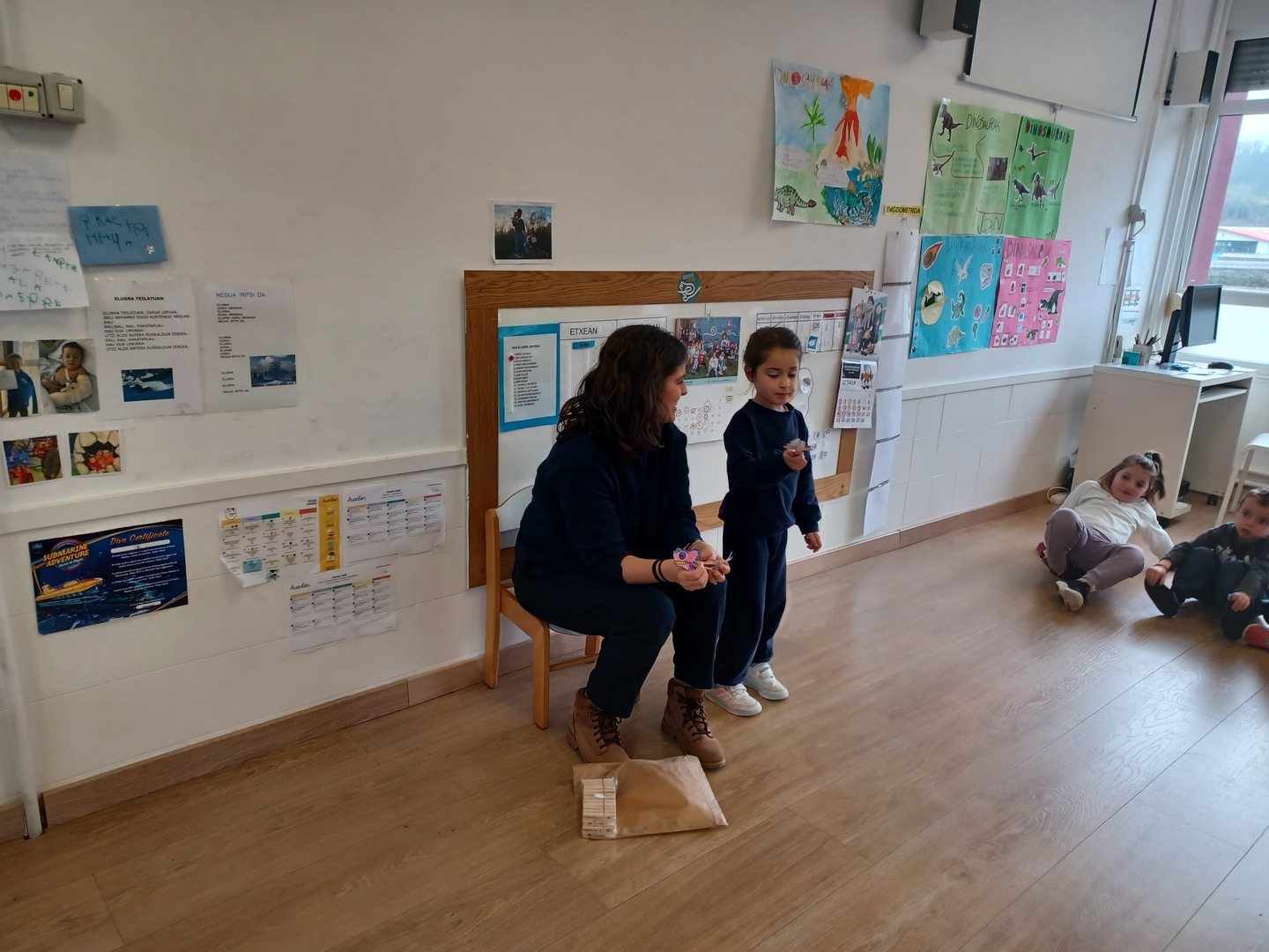 Dinosauroen gaiarekin dabiltza eta pasa den astean gelako Alaiaren ama etorri zen dinosauroen eskulan batzuk egitera.